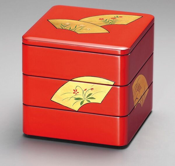 越前塗 扇面草花 6寸 三段重~箔蒔絵
