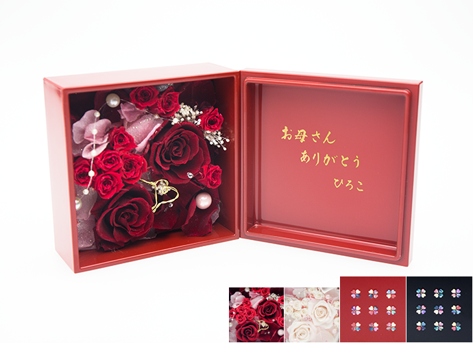 白いローズの花言葉は「尊敬」。日頃の感謝をお花で表現するのにぴったりの白のローズを、和漆器の箱の中にたっぷりと詰め込みました。暖かみのある優しい白色は、落ち着いた印象を与えます。プリザーブドフラワーの部分を取り外して、別の器に差し替えても、そのまま飾ってもお楽しみいただけるように、細部まで心を込めて制作しています。人気が高い粂治郎の漆小箱は、単独でもご利用いただけます。※漆小箱は朱と黒からお選びいただけます。