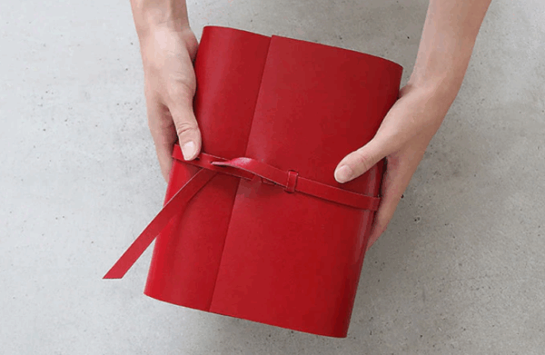 金具を極力使わず革紐で巻きとめるデザインです。裏革をまったく貼らず、完全な一枚な革で、本革らしさを感じる。
